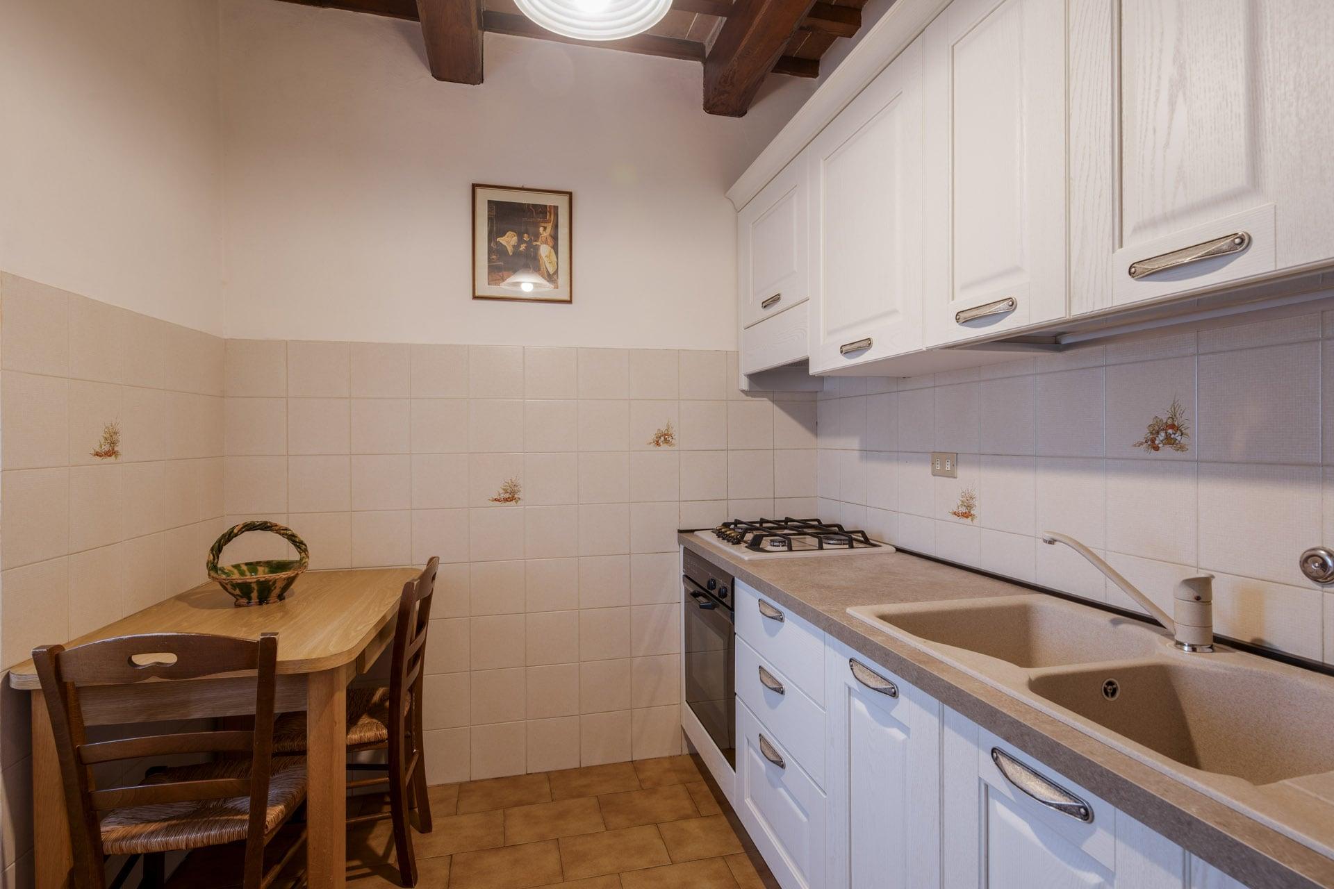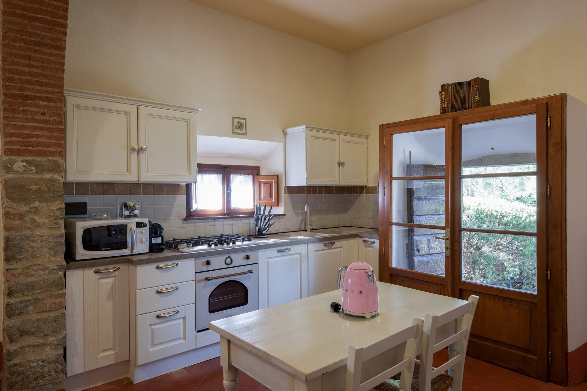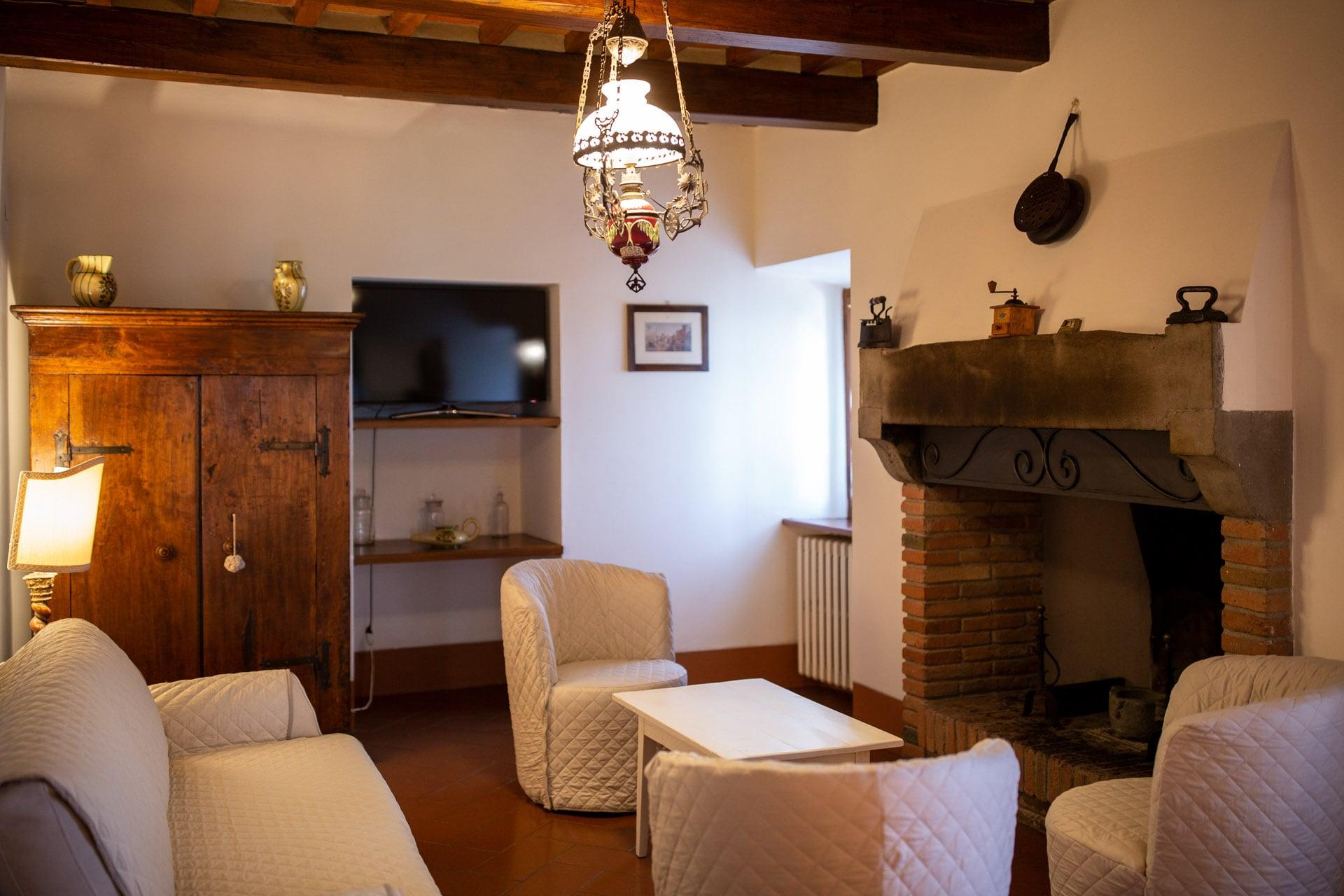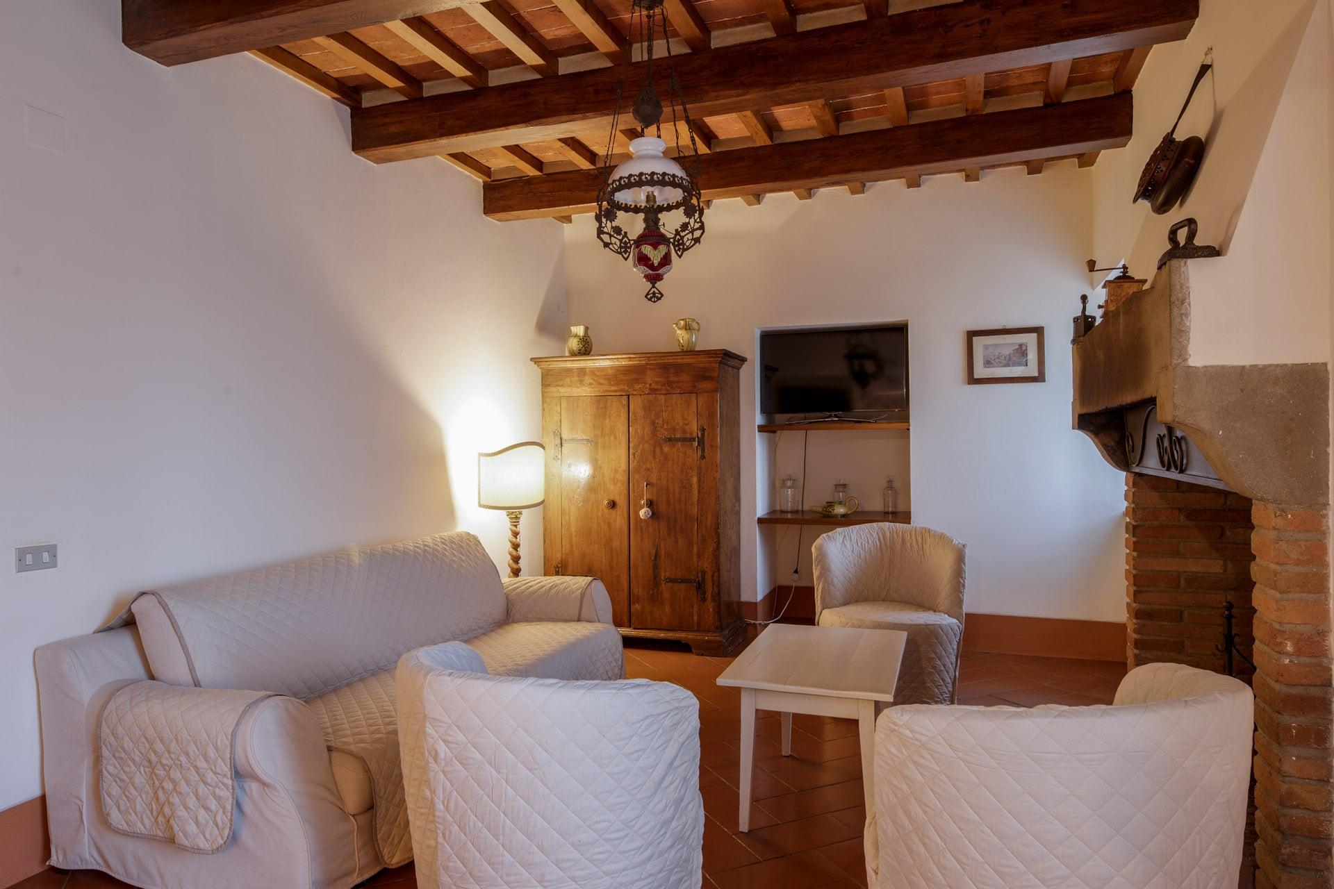 Lo stile toscano è la chiave di ingresso nell’abitazione al primo piano della Villa. Pavimenti in cotto e travi di legno a vista sul soffitto, sono i tratti distintivi delle dimore cortonesi. L’ampia sala si apre su un grande camino a parete dove condividere momenti di relax e socializzazione, conversando o guardando la tv. La cucina è attrezzata con piano cottura, forno, frigorifero, macchina per caffè espresso e moka, un tavolo di appoggio dove realizzare i piatti preferiti.
