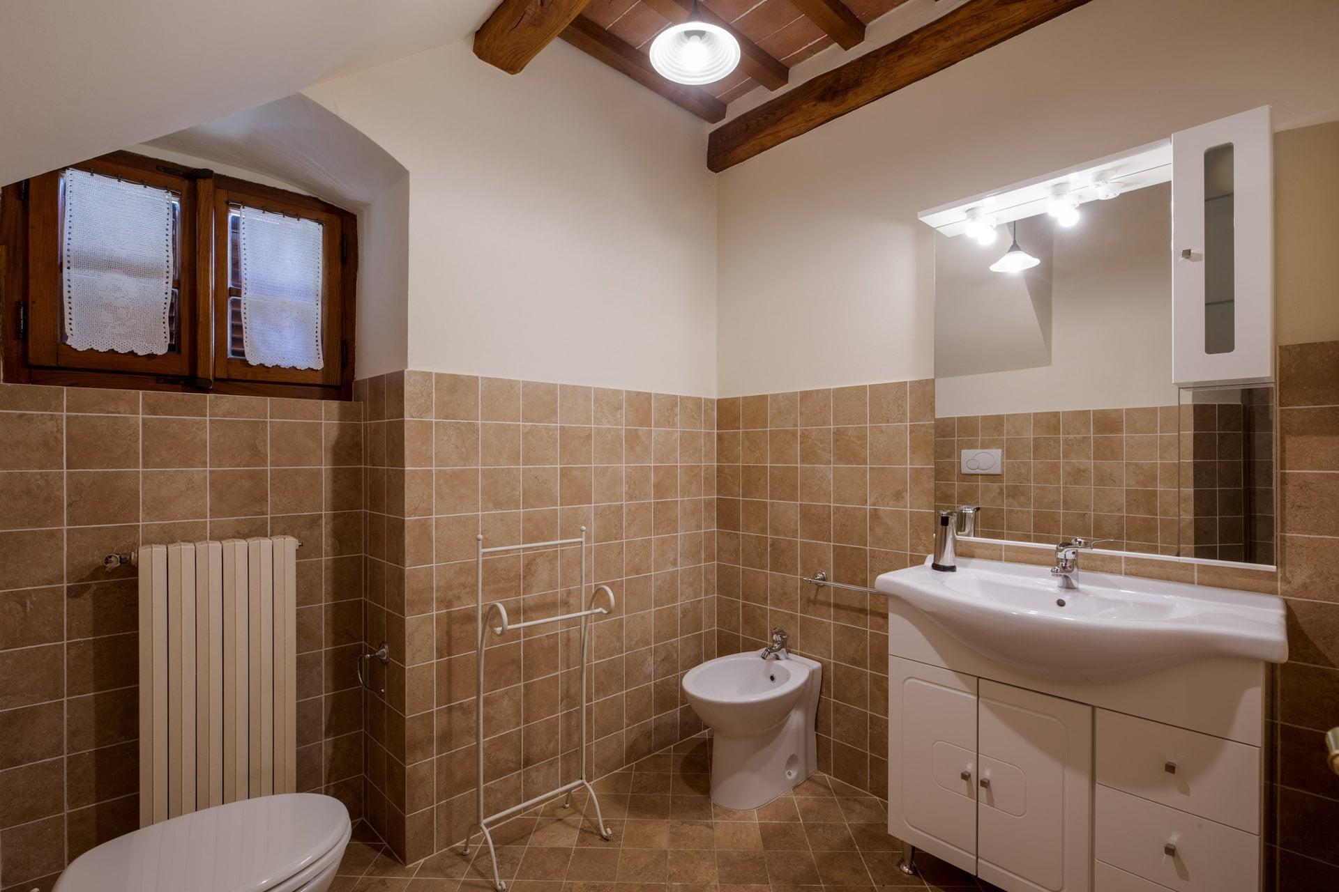 La grande camera matrimoniale offre una vista suggestiva sul panorama che si apre davanti alla Villa. La stanza è allestita in perfetto stile toscano con mobili d’epoca, pavimento in cotto e travi in legno a vista: qui ogni dettaglio è curato con amore. Il bagno è dotato di doccia a asciugacapelli. Tutto quello che serve per un soggiorno indimenticabile.