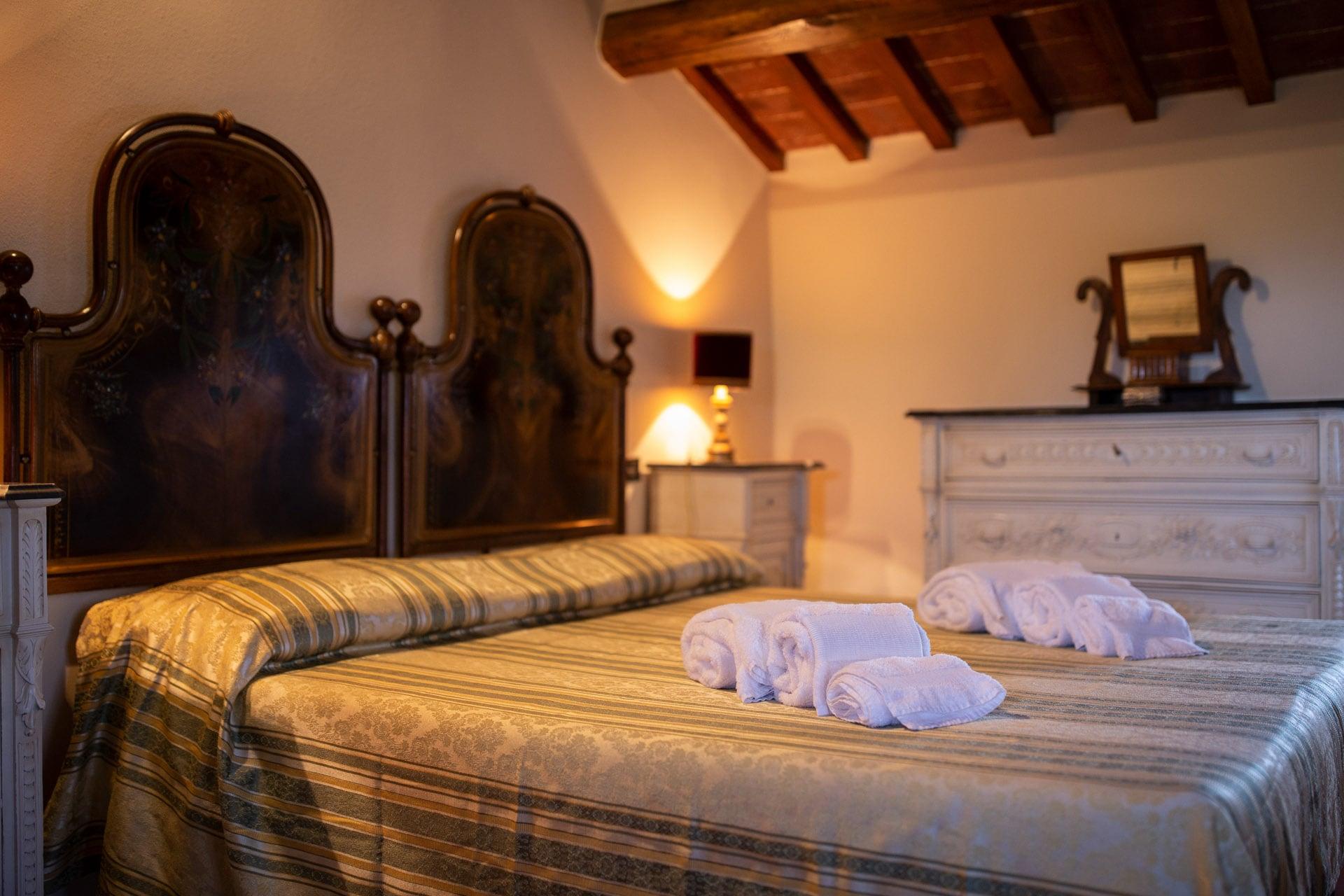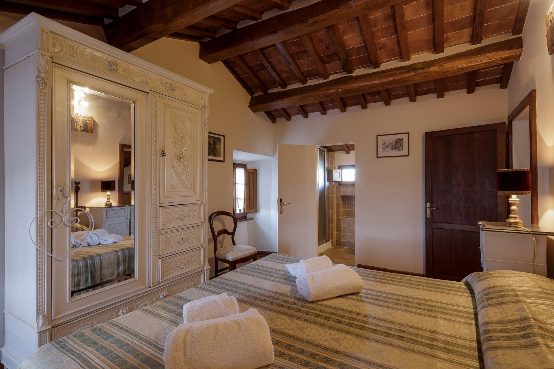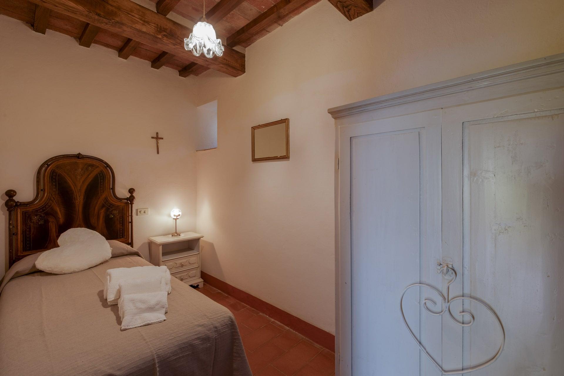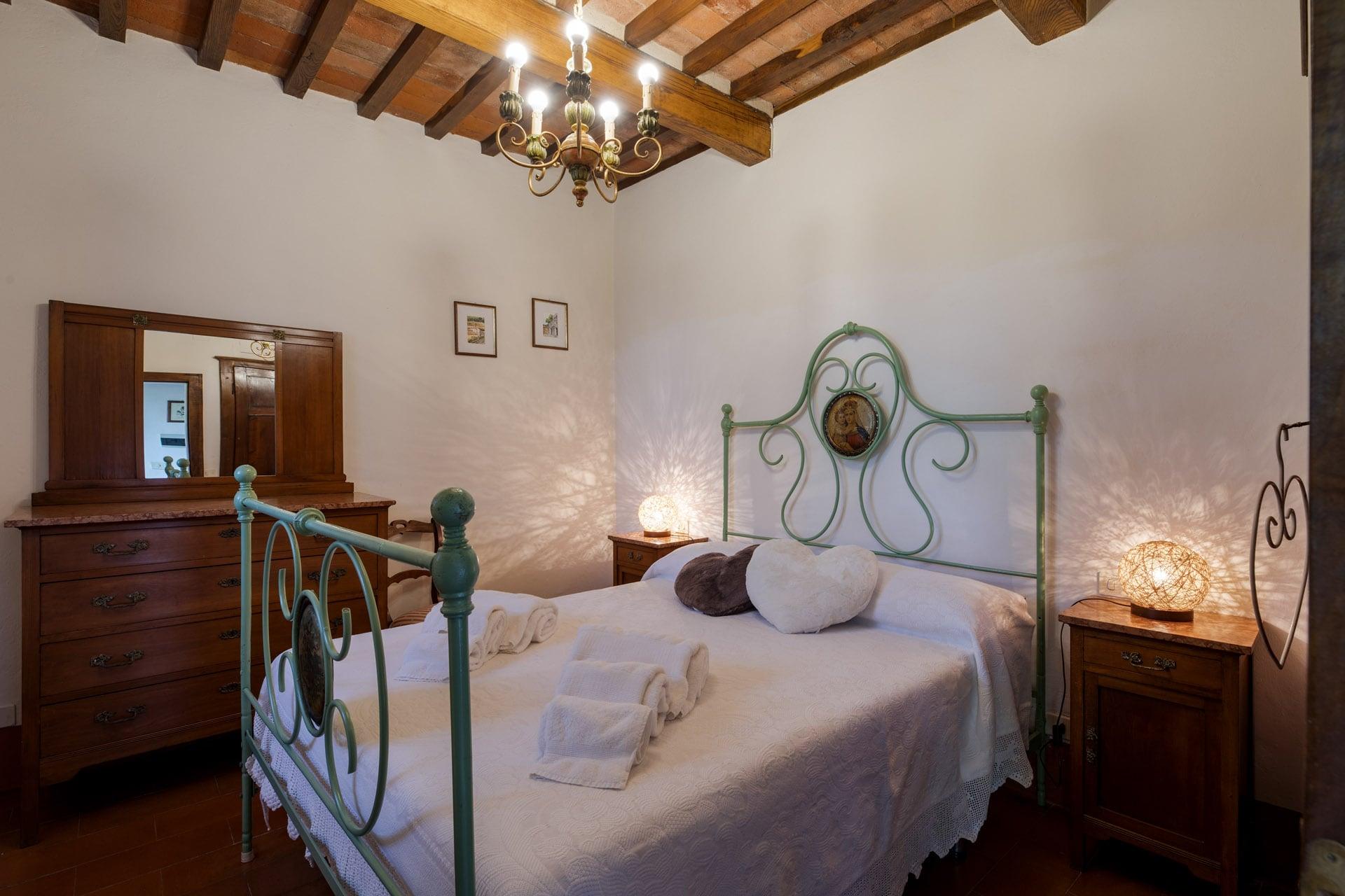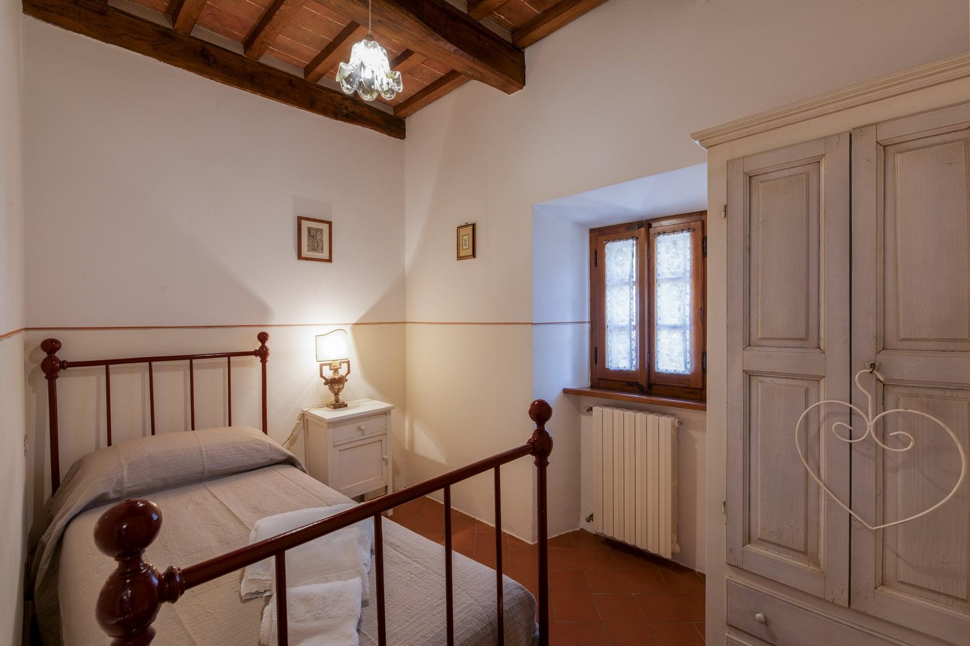 Le due camere matrimoniali sono uno “scrigno” di intimità ed eleganza con letti e mobili in stile toscano inseriti in un contesto confortevole e rilassante. La camera singola, rappresenta un’ulteriore opportunità di spazio a disposizione degli ospiti e per ogni esigenza. Complessivamente la dimora è dotata di cinque posti letto. Le stanze sono corredate da due bagni dotati di doccia e asciugacapelli che richiamano le linee dell’arredamento che rende l’abitazione il luogo ideale per una vacanza esclusiva